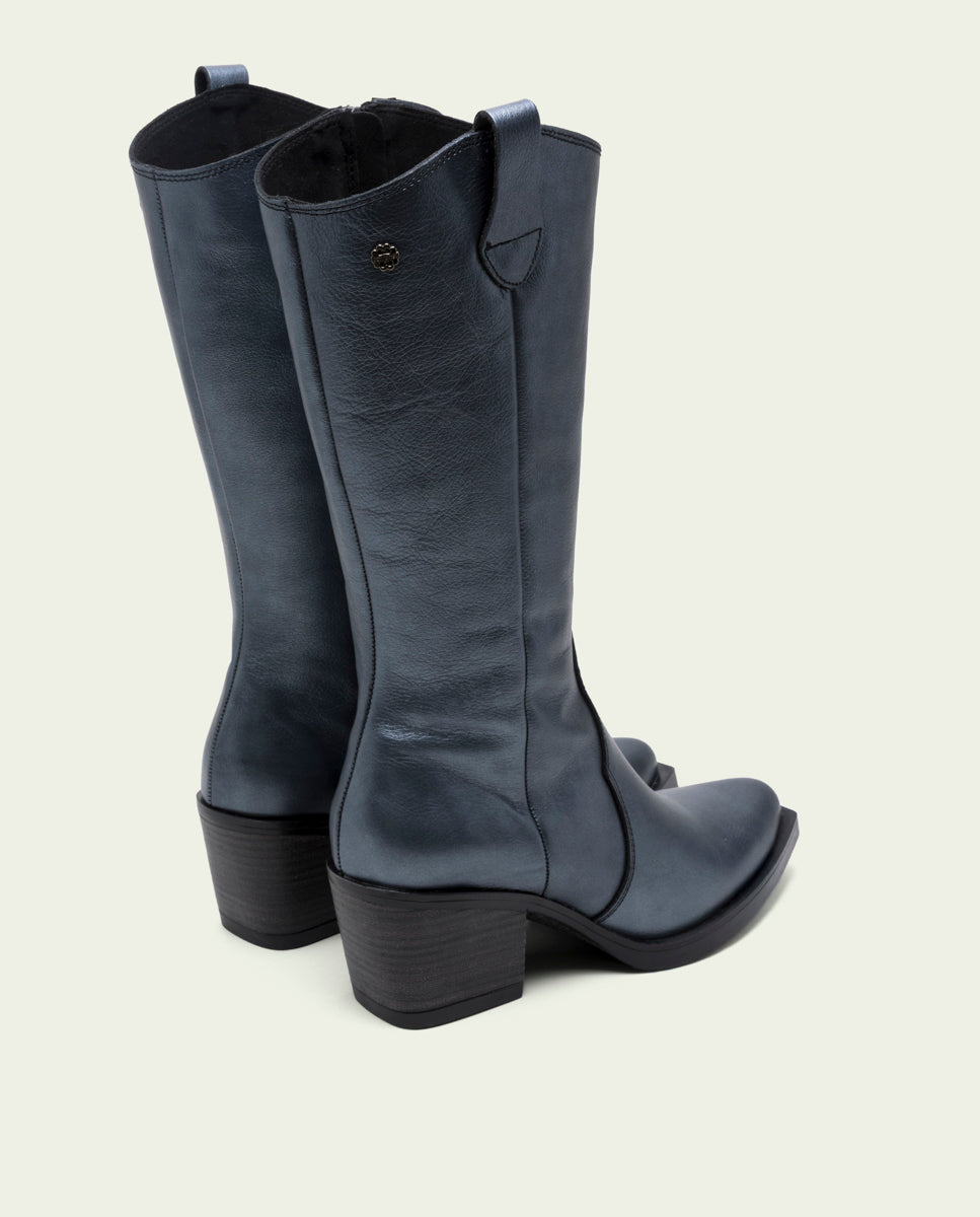 Bottes style cowboy en cuir avec finition métallisée, talon de 6,5 cm et plateforme de 1 cm. Ouverture latérale avec fermeture éclair intérieure et tirettes latérales pour faciliter l'enfilage. Semelle intérieure et doublure en microfibre avec finition velours confortable. Semelle antidérapante et souple. Fabriquées 100 % en Espagne.