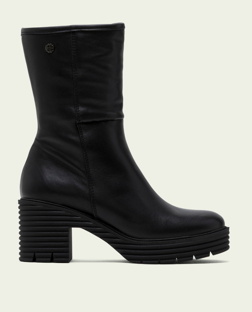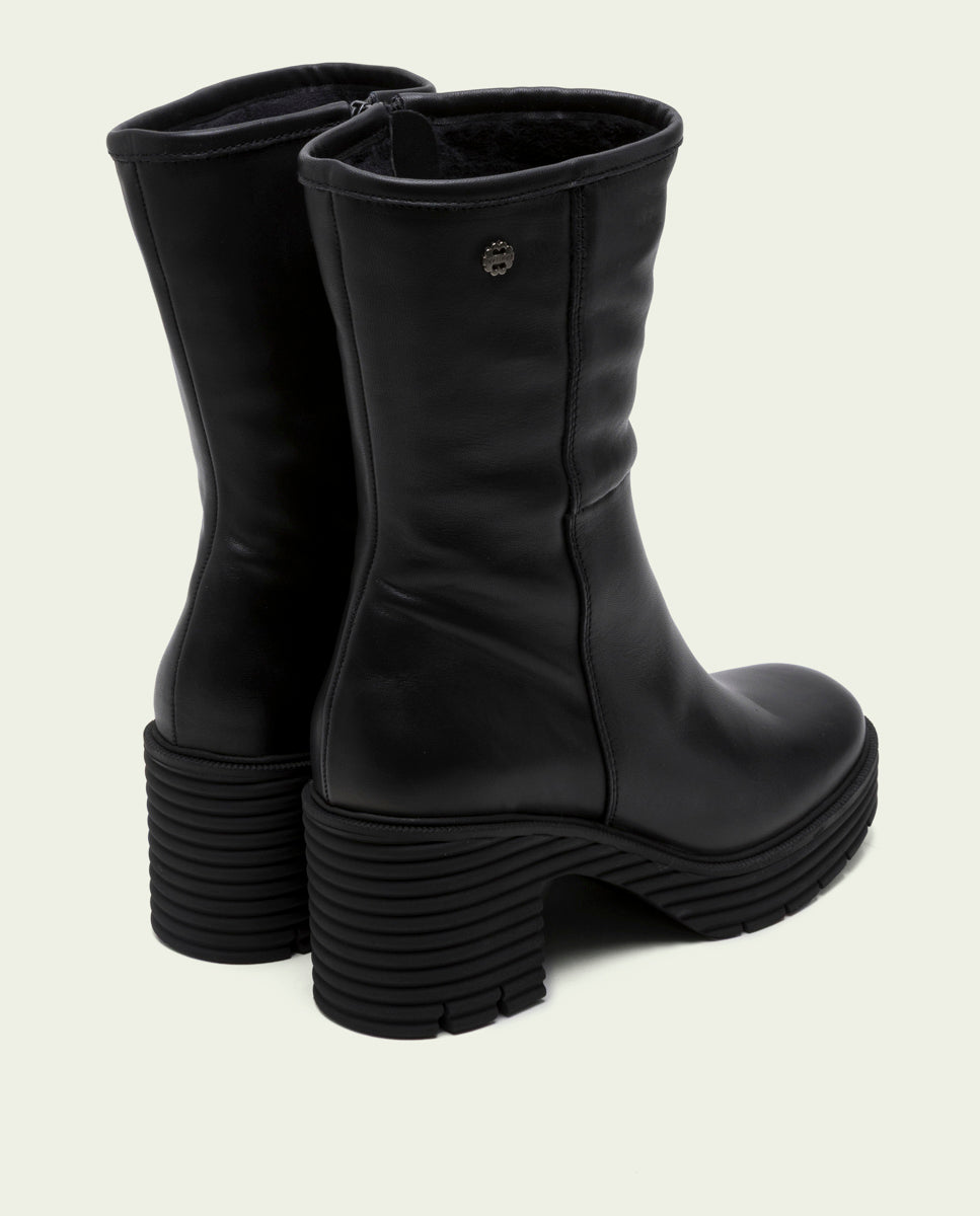Bottes mi-hautes en cuir avec semelle track, talon de 7 cm et plateforme de 2,5 cm. Ouverture latérale avec fermeture éclair pour faciliter l'enfilage. Semelle intérieure et doublure en microfibre avec finition confort. Semelle antidérapante et souple.