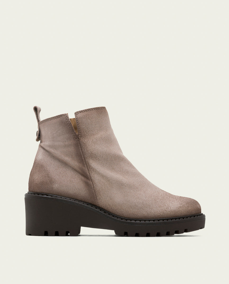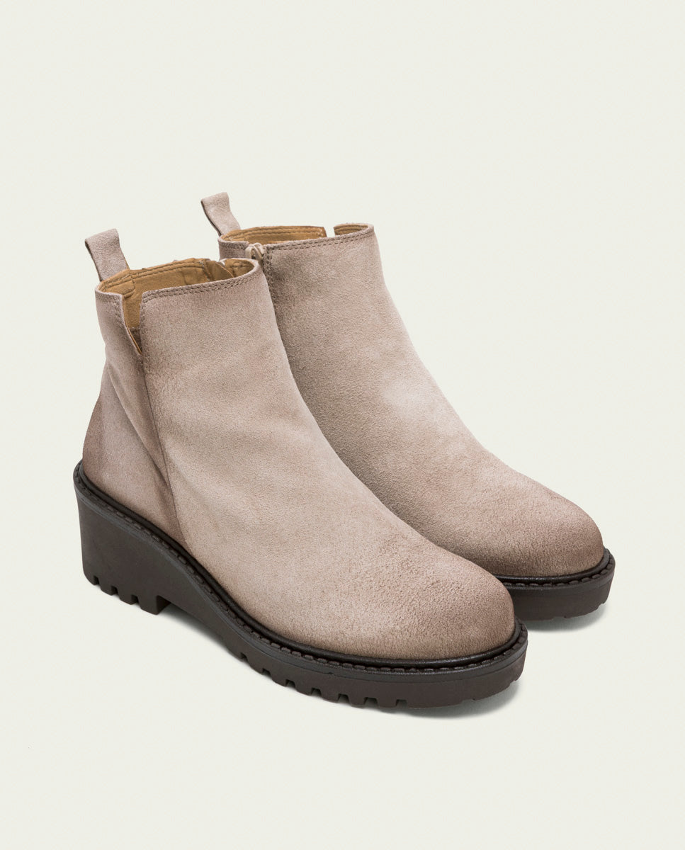 Bottines en cuir suédé avec talon compensé de 5,5 cm et plateforme de 2 cm. Découpe supérieure en V et ouverture latérale avec fermeture éclair intérieure pour faciliter l'enfilage. Semelle intérieure et doublure en microfibre avec finition velours confortable. Semelle antidérapante et souple. Fabriquées 100 % en Espagne.