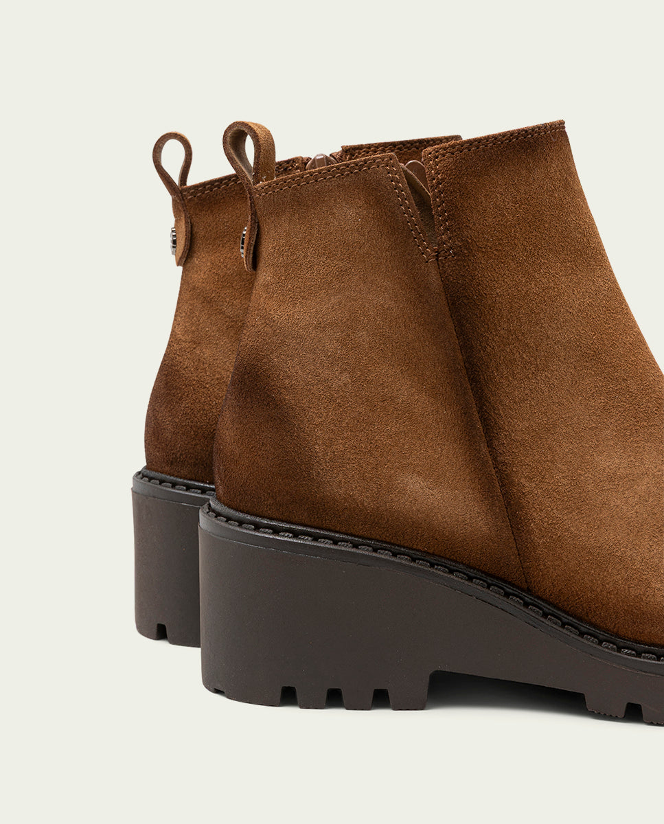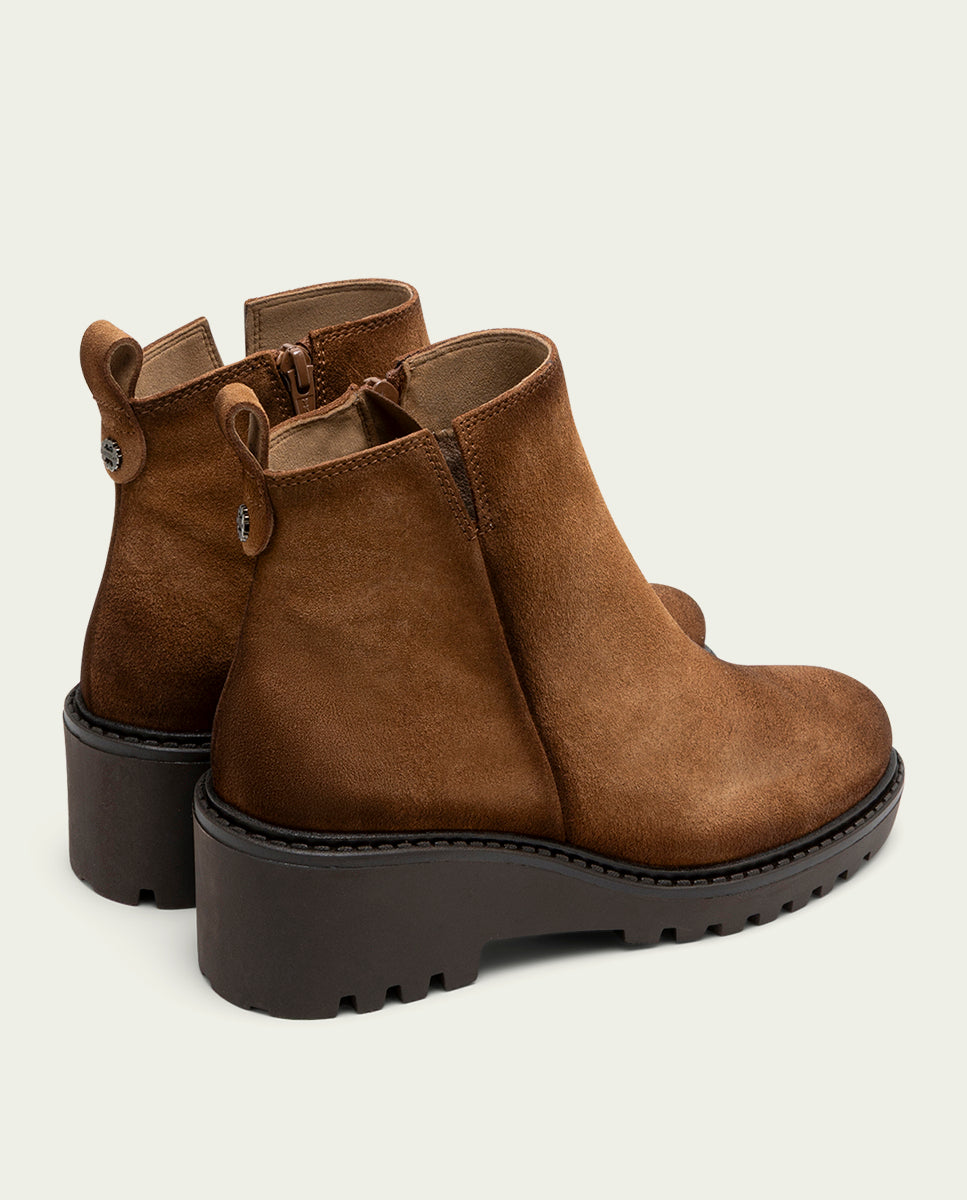 Bottines en cuir suédé avec talon compensé de 5,5 cm et plateforme de 2 cm. Découpe supérieure en V et ouverture latérale avec fermeture éclair intérieure pour faciliter l'enfilage. Semelle intérieure et doublure en microfibre avec finition velours confortable. Semelle antidérapante et souple. Fabriquées 100 % en Espagne.