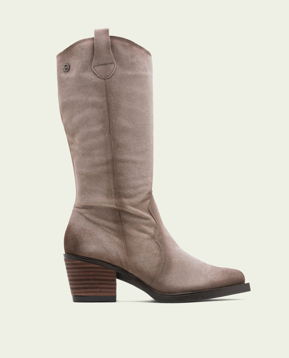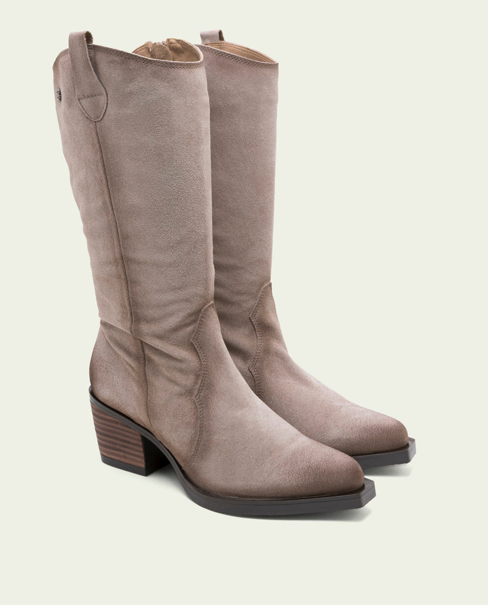 Bottes style cowboy de suède avec talon de 6,5 cm et plateforme de 1 cm. Ouverture latérale avec fermeture éclair intérieure et tirants latéraux pour faciliter l'enfilage. Semelle et doublure en microfibre avec finition confort velouté. Semelle antidérapante et flexible. Élaboré 100 % en Espagne.