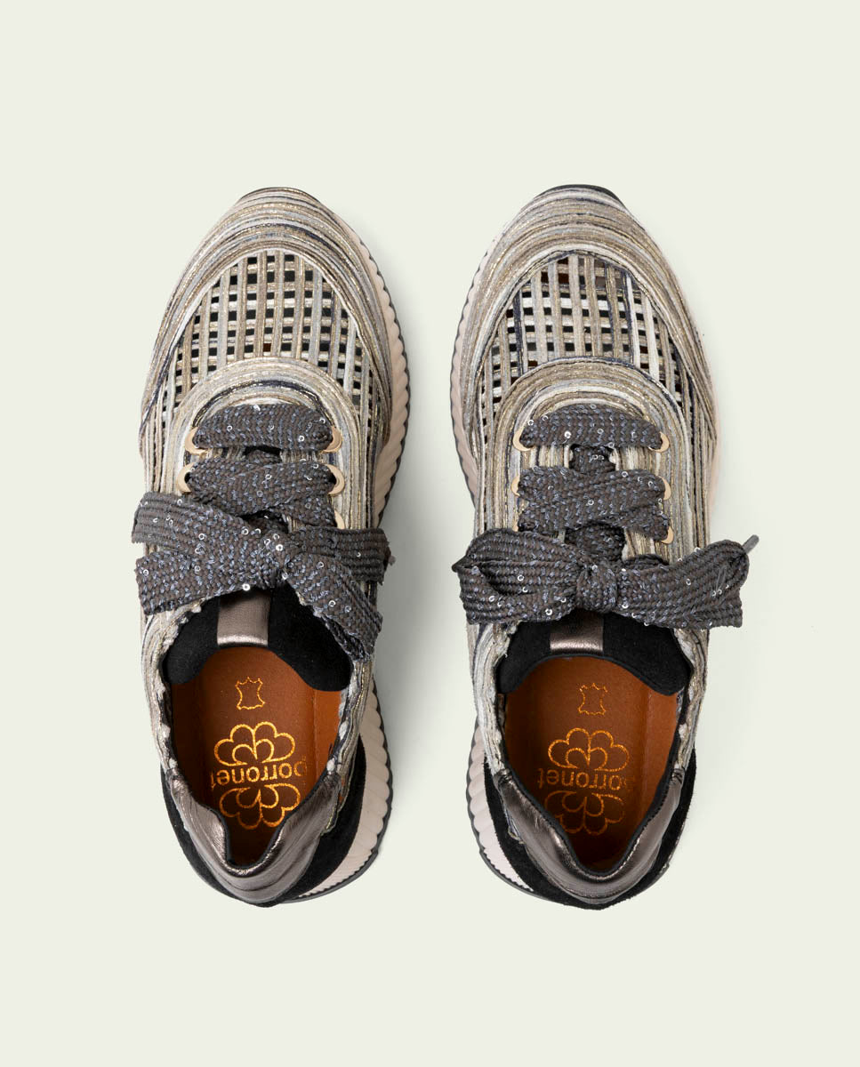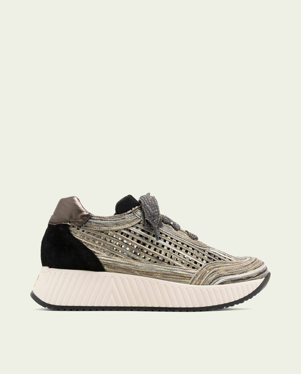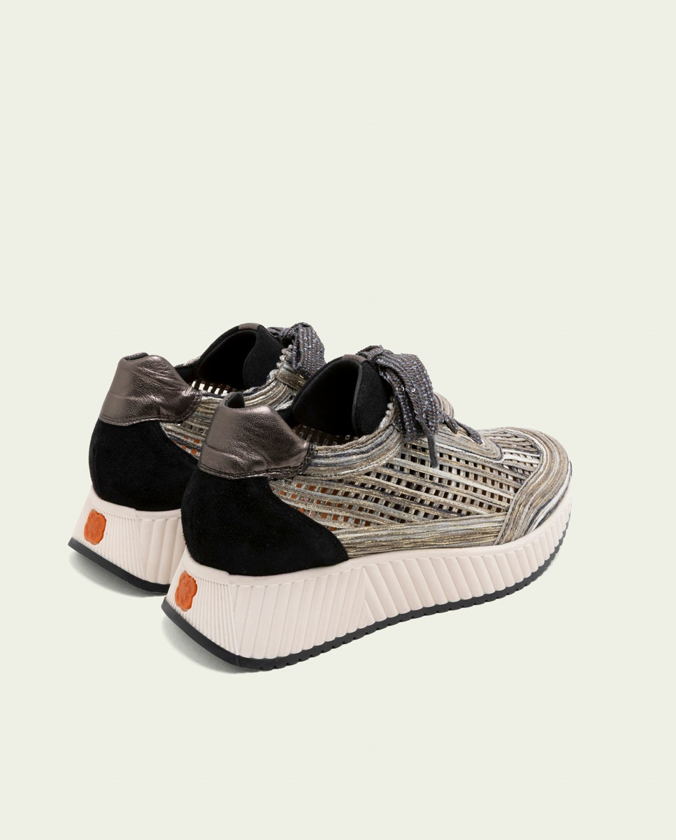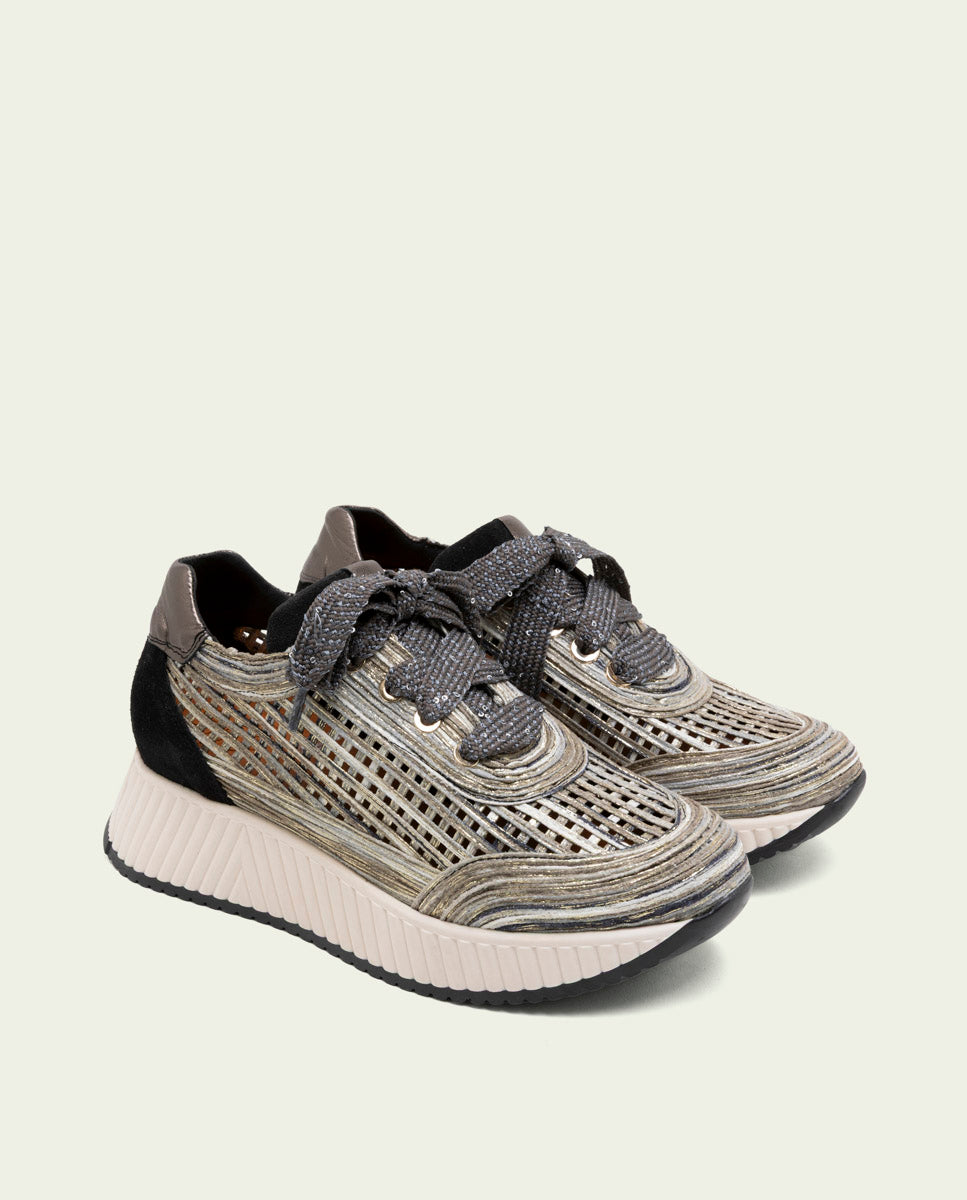Chaussure de sport en cuir avec découpes textiles ajourées combinant différentes nuances d'une même gamme chromatique et détails métallisés. Talon et languette en cuir et cuir suédé assortis. Fermeture à lacets ornés de petites paillettes pour une touche subtile mais élégante. Empiècements métalliques. Semelle intérieure rembourrée en cuir et semelle antidérapante garantissant un grand confort. Talon de 4,5 cm et plateforme avant de 2,5 cm. Semelle antidérapante en caoutchouc ondulée avec logo de la marque contrasté à l'arrière du pied.