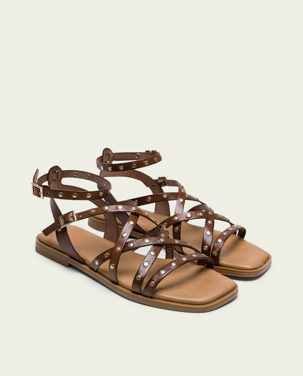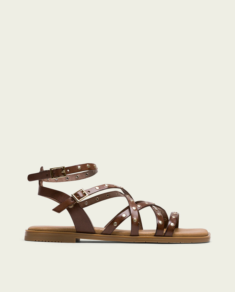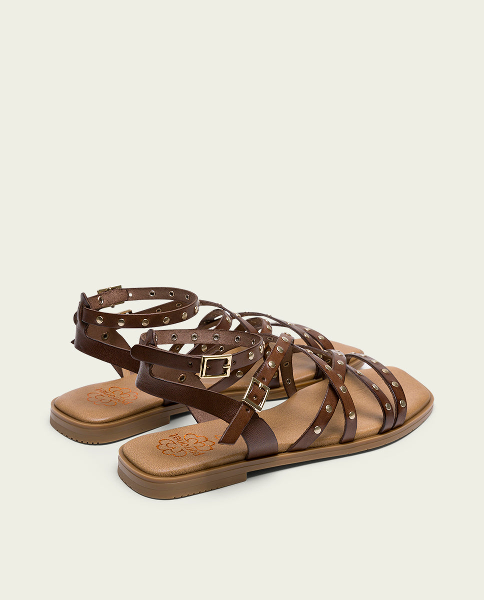 Sandale plate en cuir à brides croisées, décorée de petits clous métalliques qui lui confèrent un style moderne et accrocheur. Fermeture à double boucle sur le cou-de-pied et sur la bride autour de la cheville pour un meilleur maintien et un ajustement confortable et sûr. La semelle intérieure est rembourrée en cuir pour un plus grand confort, idéal pour les longues promenades ou pour profiter d'une journée d'été. Fabriqué à la main à 100 % en Espagne
