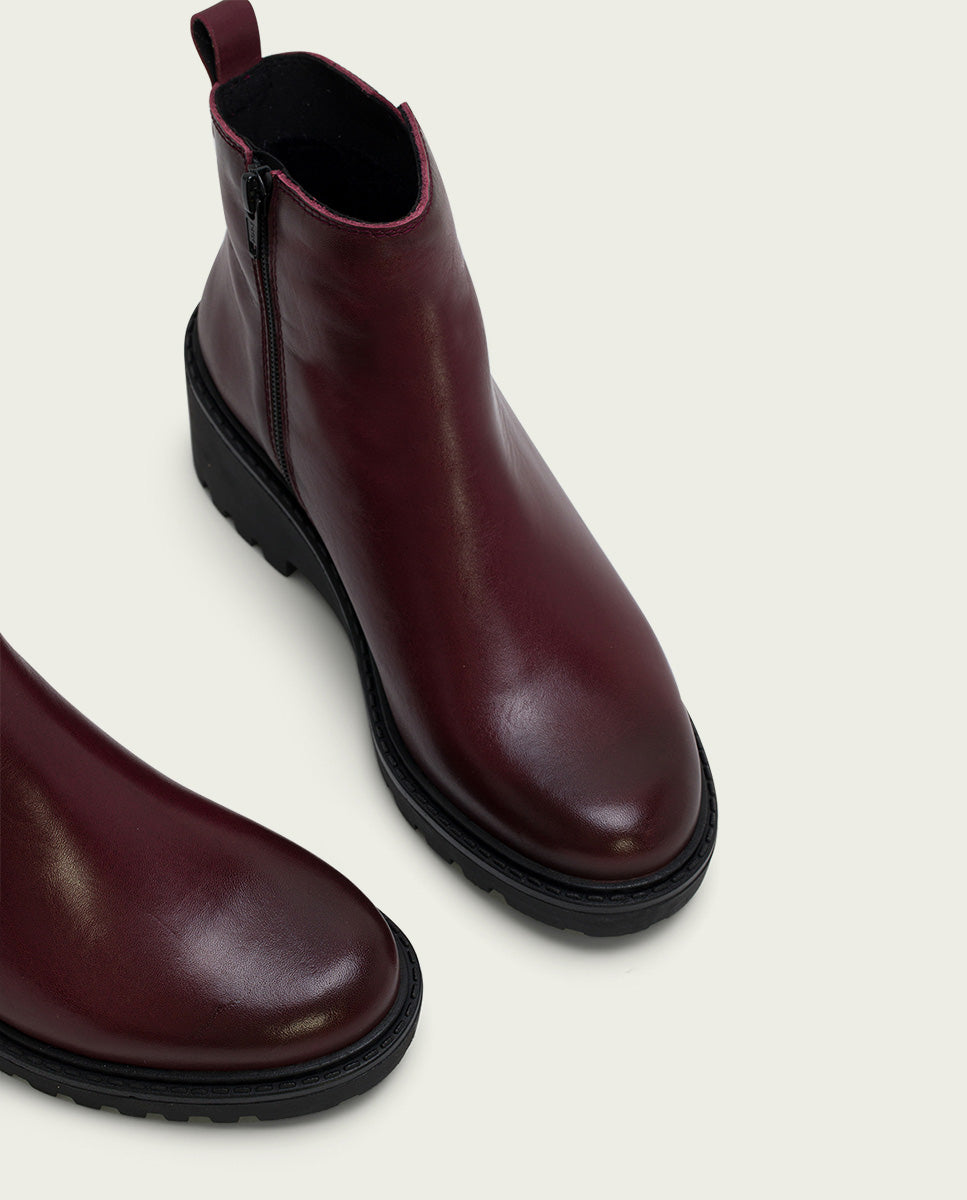 BOTTINES EN CUIR À TALON COMPENSÉ ET ÉCLAIR BORDEAUX ELENA