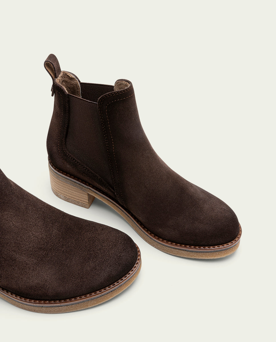Bottines en cuir suédé avec talon de 5 cm et plateforme de 2 cm. Élastiques sur les côtés pour faciliter l'enfilage. Tige en cuir suédé, semelle intérieure et doublure en microfibre avec finition velours confortable. Semelle antidérapante et souple. Fabriquées 100 % en Espagne.