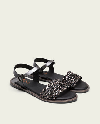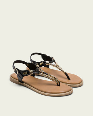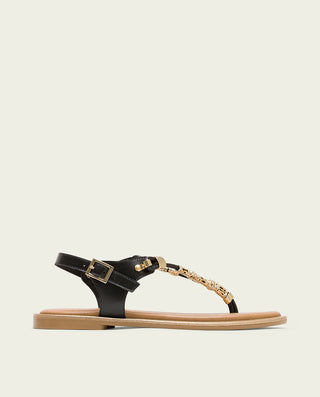 SANDALE THONG PLATE EN CUIR AVEC PERLES NOIRES ESTELA