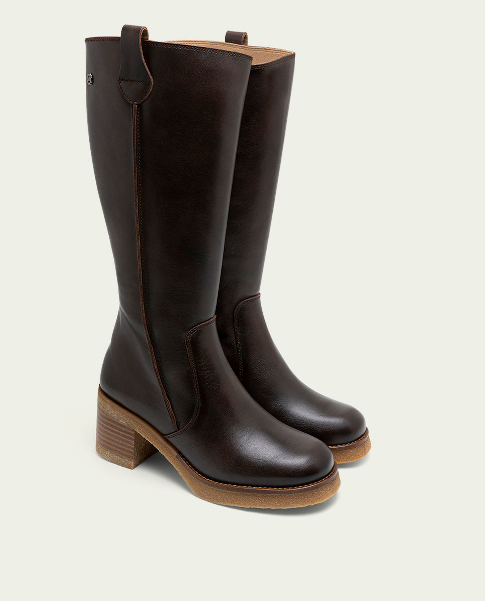 Bottes en cuir avec talon de 6,5 cm et plateforme de 2,5 cm, avec bride et boucle. Fermeture éclair intérieure pour faciliter l'enfilage. Semelle intérieure et doublure en microfibre avec finition velours confortable. Semelle antidérapante et souple. Fabriquées à 100 % en Espagne.