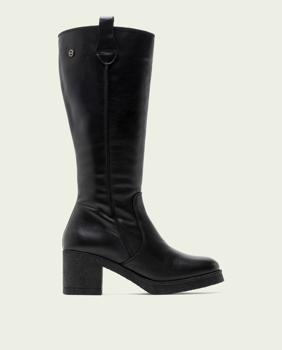 Bottes en cuir avec talon de 6,5 cm et plateforme de 2,5 cm, avec bride et boucle. Fermeture éclair intérieure pour faciliter l'enfilage. Semelle intérieure et doublure en microfibre avec finition velours confortable. Semelle antidérapante et souple. Fabriquées à 100 % en Espagne.
